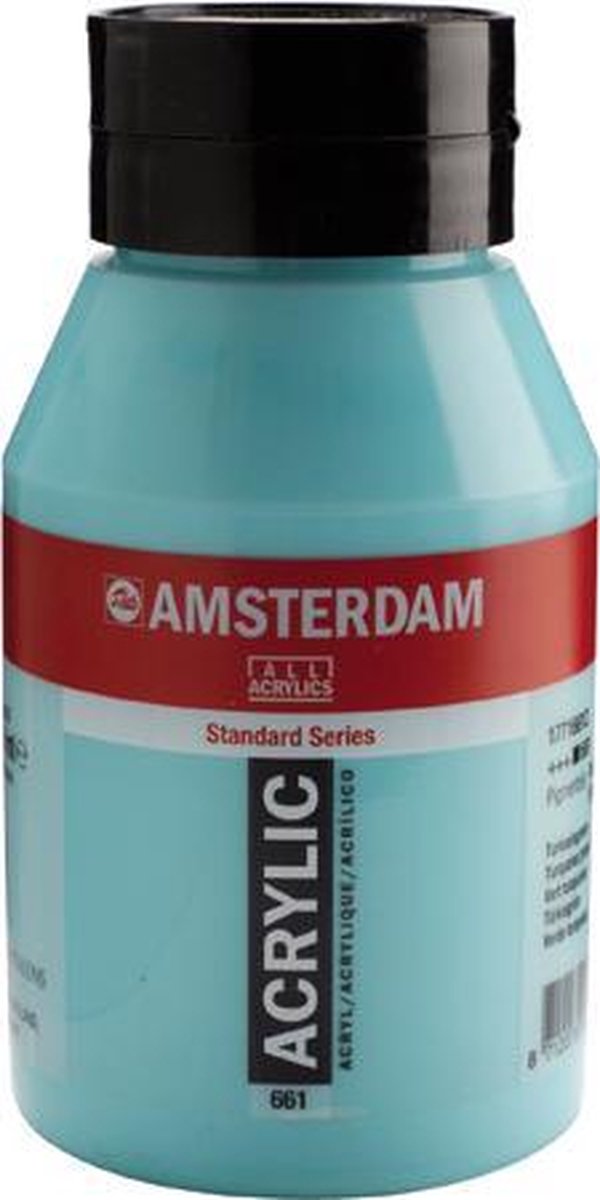 Grote pot van een liter dekkend turkooisgroene acrylverf uit de Standard Series van Amsterdam All Acrylics. Ideaal voor grootverbruikers! Royal Talens Artikel 17716612