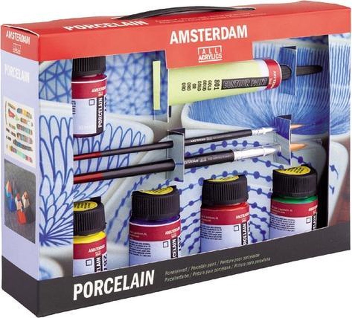 Leuke startset met vijf frisse kleuren Amsterdam porseleinverf in 16 ml flacons, penselen en contourverf. Met deze verf kun je hittebestendige ondergronden zoals porselein, gebakken aardewerk, hittebestendig glas en metaal beschilderen. De verf vloeit mooi uit en is makkelijk aan te brengen met de bijgeleverde penselen. Als je de beschilderde voorwerpen afbakt in de huishoudoven, zijn ze ook nog eens vaatwasmachinebestendig. Dat geldt ook voor de contourverf die je, dankzij de handige doseertuit, rechtstreeks uit de tube kunt gebruiken. Zo kun je op een simpele manier unieke kunstvoorwerpen maken. Superleuk om je eigen serviesgoed te decoreren, maar natuurlijk ook heel leuk om originele cadeaus voor speciale gelegenheden te maken. Denk aan een huwelijk, geboorte of verjaardag. Amsterdam porseleinverf hecht dankzij het speciale bindmiddel op gladde ondergronden en is snel droog. Inhoud: - Handleiding - 1 tube contourverf 801 goud - 2 penselen serie 661 nr 2 en nr 8 - 5 flacons 16 ml