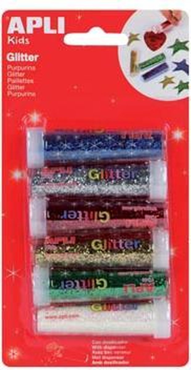 Apli glitterpoeder 6 tubes in 6 geassorteerde kleuren: groen, wit, zilver, goud, rood en blauw. Met doseerdop om juiste hoeveelheid te gebruiken.