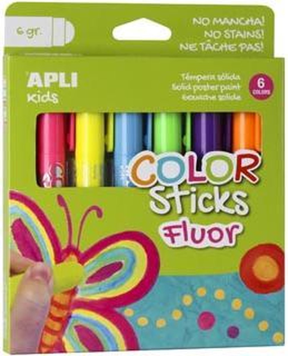 Apli Kids plakkaatverf Color Sticks Vaste plakkaatverf in stickformaat. Ideaal om te tekenen en schilderen op papier, gekleurd karton, knutselpapier, etc. Maakt geen vlekken, vergt geen vernis en droogt snel. Stick bevat 10 g. Doos met 6 sticks. geassorteerde fluor kleuren: geel, roze, blauw, groen, oranje en paars