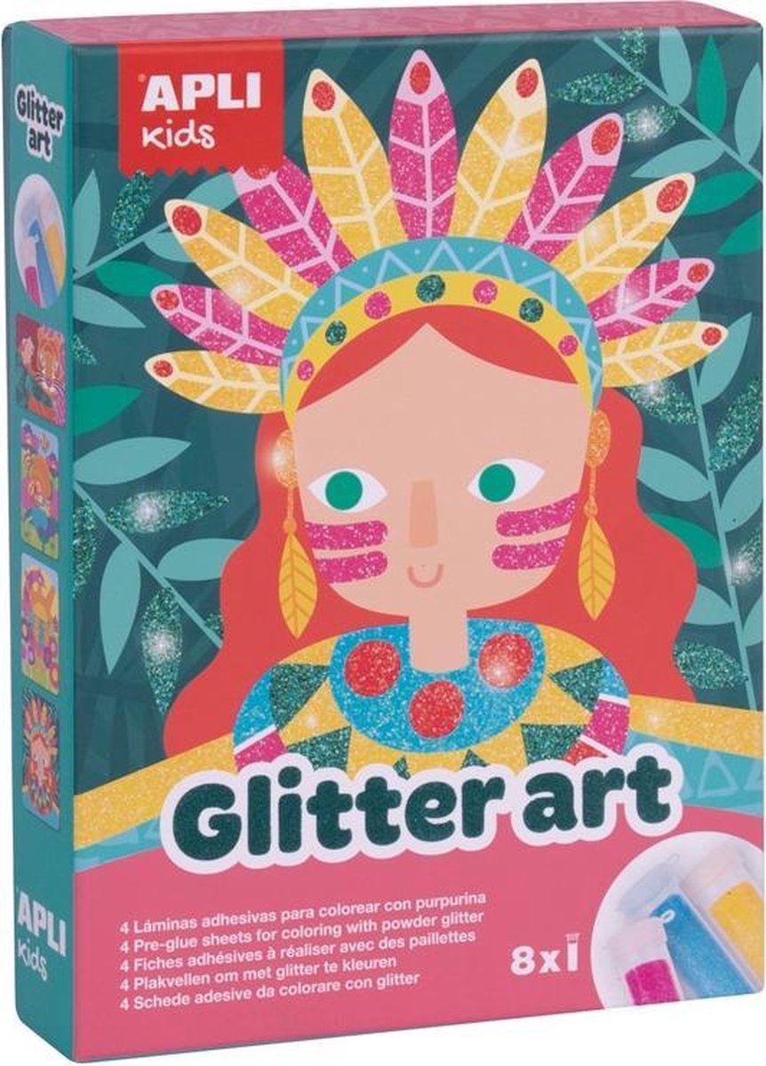 Kleuren met met glitter. Gemakkelijk en leuk: je hoeft alleen maar het zelfklevende deel bloot te leggen (met behulp van de meegeleverde tool) en de glitter uit te spreiden om de ontwerpen te kleuren. Een APLI Kids exclusief ontwerp, kleurrijk en origineel. Een product met een geweldige inhoud, elke verpakking bevat al het materiaal dat nodig is om 4 tekeningen te maken: 4 kaarten met de ontwerpen in kleur gedrukt, 8 verschillende kleuren glitter en een plastic tool. Gemakkelijk te gebruiken: de bedrukte kleefkaarten hebben geen extra kleefstof nodig.