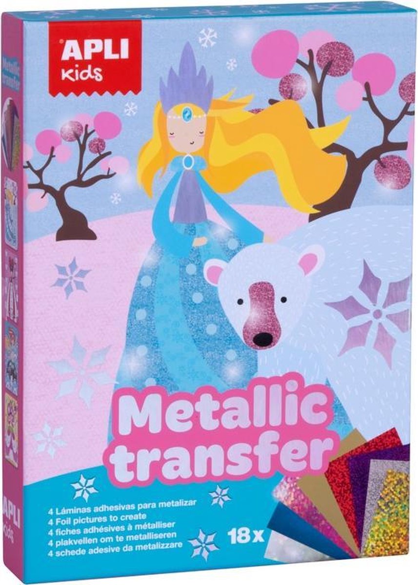 Een spel met zelfklevende films om verrassende kleurplaten te maken met overdraagbaar metaalpapier. Het doel van het spel is om de tekeningen van de kaarten in te kleuren met de vellen transferpapier. Til de zelfklevende delen van de kaarten op met het plastic gereedschap en vul ze in met het metallic papier van de juiste kleur. Het spel omvat: 4 geïllustreerde vellen met zelfklevend voorgesneden folie, 18 vellen overdraagbaar metaalpapier, 1 plastic hulpmiddel en 1 geleideblad.
