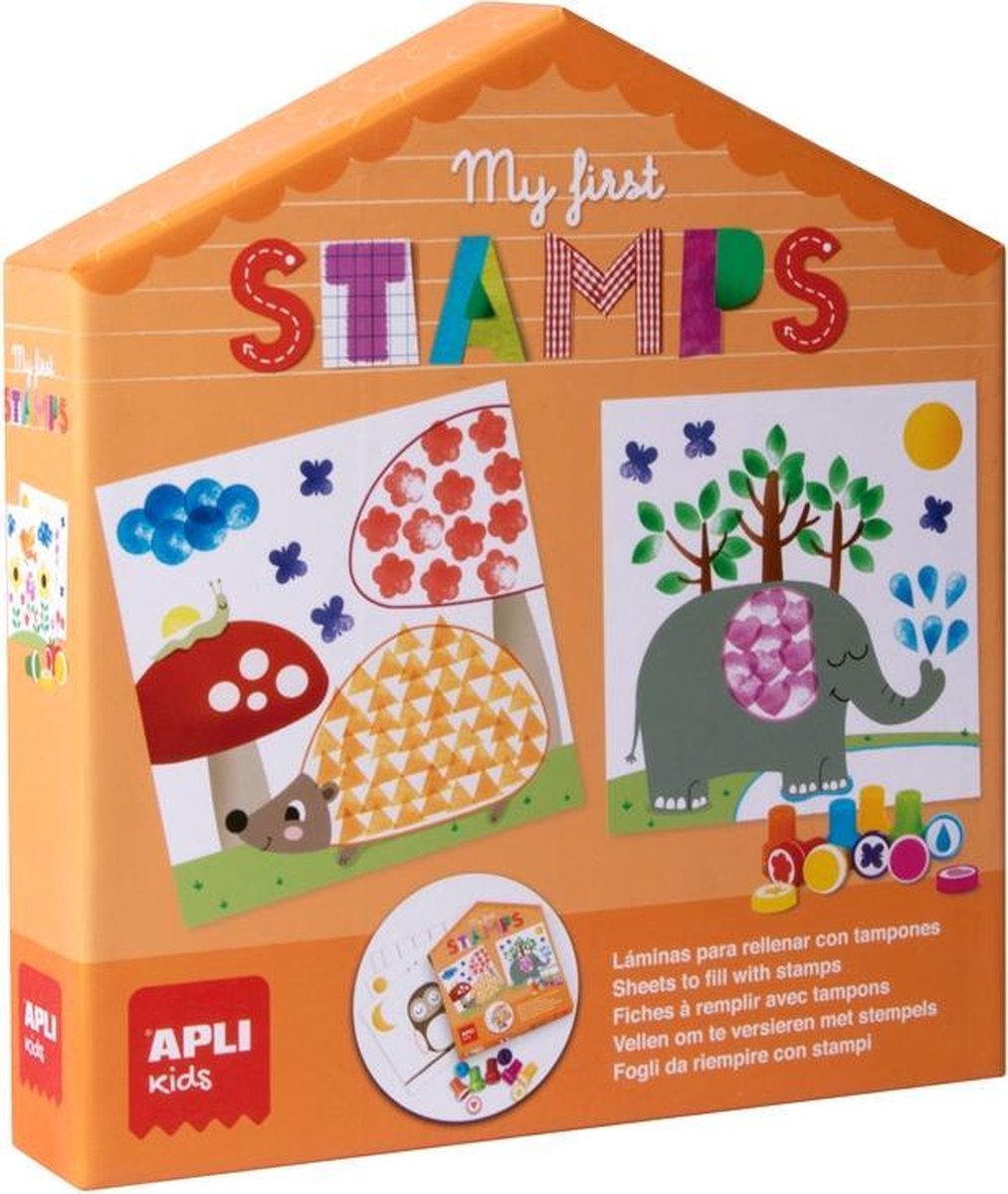 Het stempel kleurset bestaat uit het stempelen van verschillende vormen in de aangegeven gebieden van elk ontwerp. Het omvat 6 vellen met verschillende dieren en hun omgeving, 10 tampons met verschillende vormen en kleuren, 1 boek met instructies en voorbeelden van hoe ze in te kleuren.