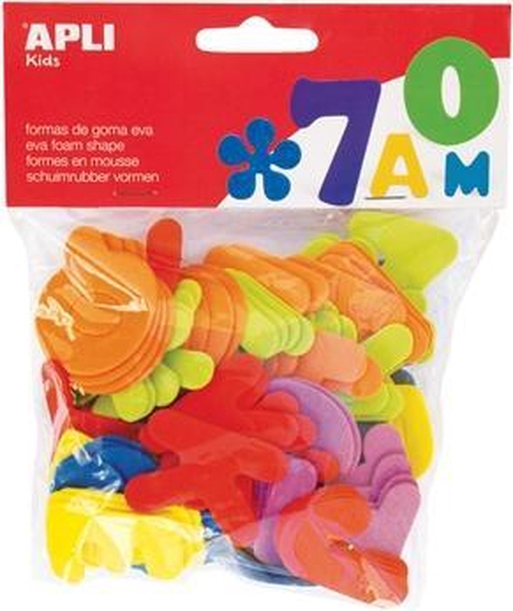 Apli Schuimrubber vormen Dikte: 1,8 mm. Geassorteerde kleuren: groen, blauw, geel, oranje, rood en paars. Op blister. letters, 104 stuks
