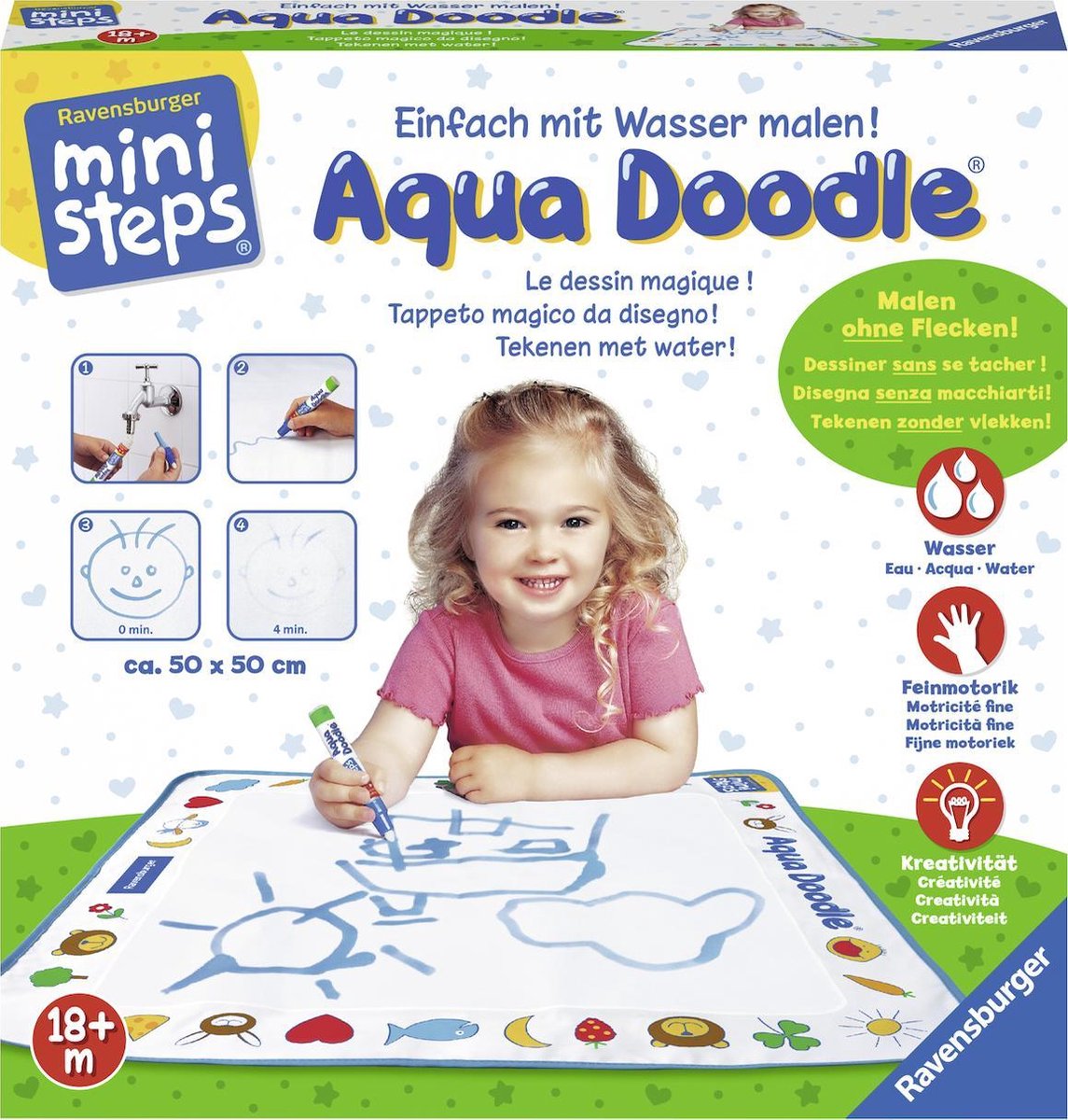 De allereerste tekeningen met Aqua Doodle® van Ravensburger. Onbekommerd tekenen zonder kans op geklieder en vlekken. Fantastisch! De stift vullen met leidingwater. Het water maakt blauwe lijnen op de tekenmat en ze verdwijnen als het water opdroogt. Het oefent de fijne motoriek en bevordert de concentratie en creativiteit. Inhoud: 1 Aqua Doodle® pen 1 Aqua Doodle® tekenmat