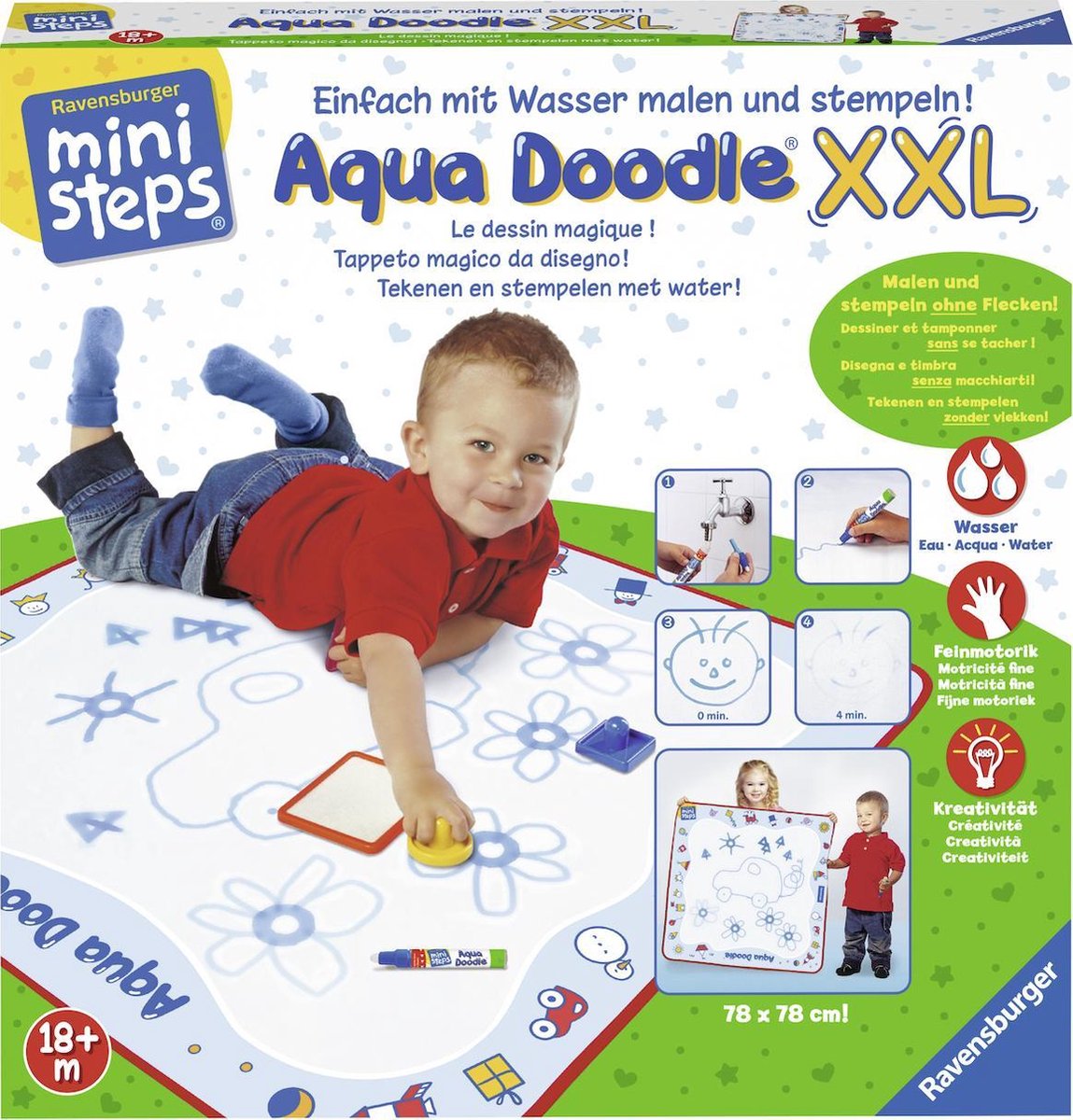 Ministeps Aqua Doodle XXL. Schilder- en stempelplezier in het groot! In de stift en stempels zit alleen zuiver leidingwater, maar op de magische mat kun je ermee schilderen en stempelen! Zodra het water opdroogt, verdwijnt alles en begint het spel weer van voor af aan! De enorme stoffen mat biedt veel plaats om de fijne motoriek en creativiteit te trainen. Vrolijke motieven rond het schilderoppervlak bieden talrijke suggesties. Praktisch: de mat kan klein worden opgerold om mee te nemen. Voor baby's vanaf 18 maanden.