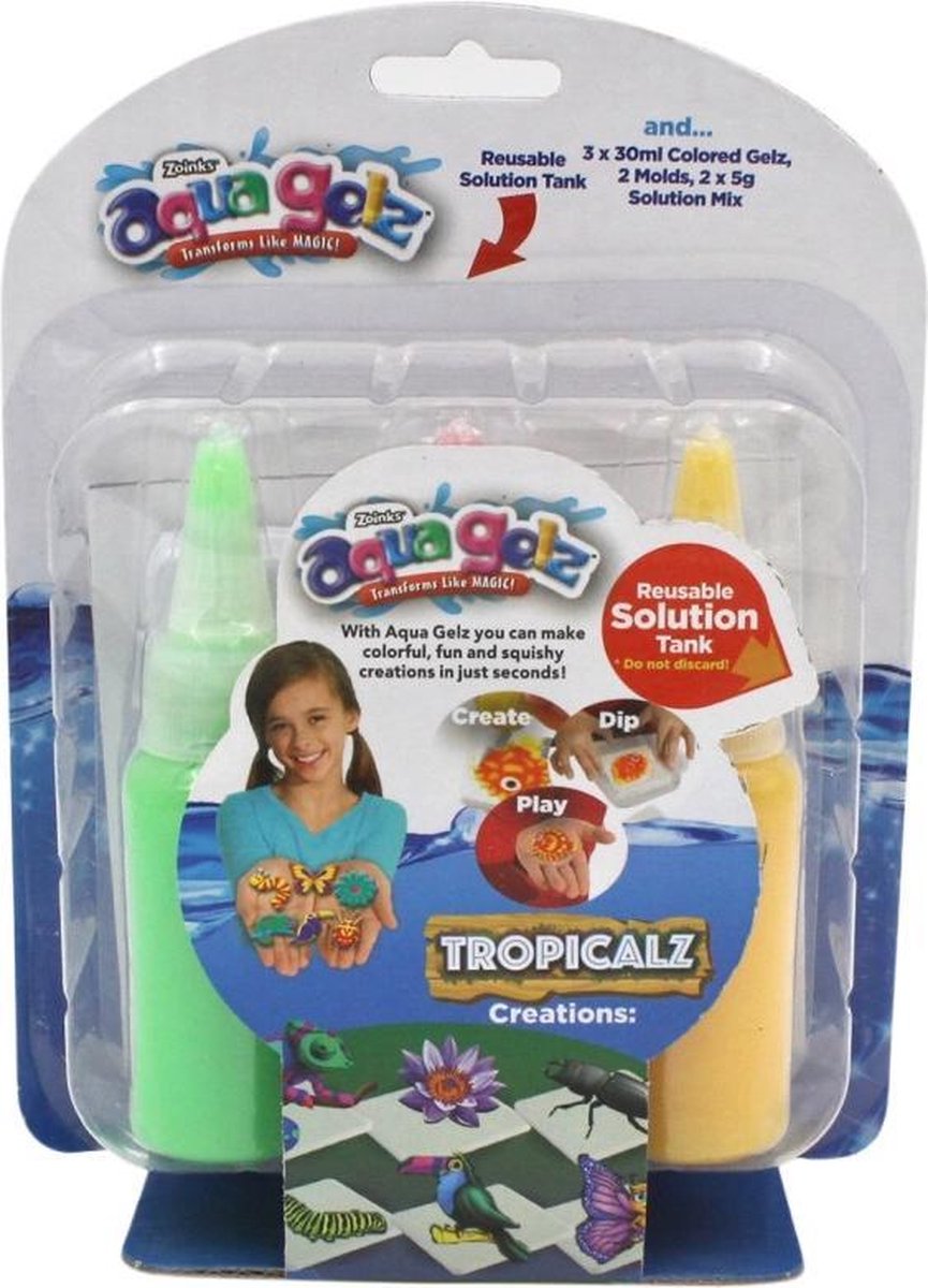 Ga creatief aan de slag met dit leuke Aqua Gelz tropicals starterpack! Vul de verpakking, die tegelijk een mengbak is, met de aqua gelz oplossing en water. Kies daarna een mal en vul die met een kleur Aquz Gelz en versier hem met de andere kleuren. Houd daarna de mal even in de oplossing en als je hem er weer uithaalt, heb je zelf een leuk figuurtje gemaakt! De set bestaat uit 3 kleuren gel, 2 mallen, een herbruikbare oplosbak en 2 zakjes oplospoeder. Aqua Gelz Starter Pack Tropicalz is geschikt voor kinderen vanaf 5 jaar.