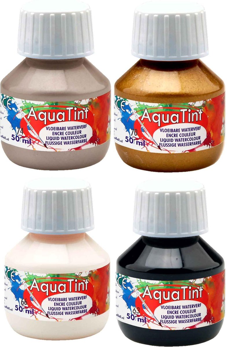 Aqua Tint is een transparante waterverf / tekeninkt die gebruiksklaar en met grote kleurkracht is. Geschikt voor airbrush- en aquarel technieken, spatten en transparante tekeningen. Verkrijgbaar in 16 kleuren. Deze set bevat 6 Kleuren: Zwart, Wit, Goud, Zilver