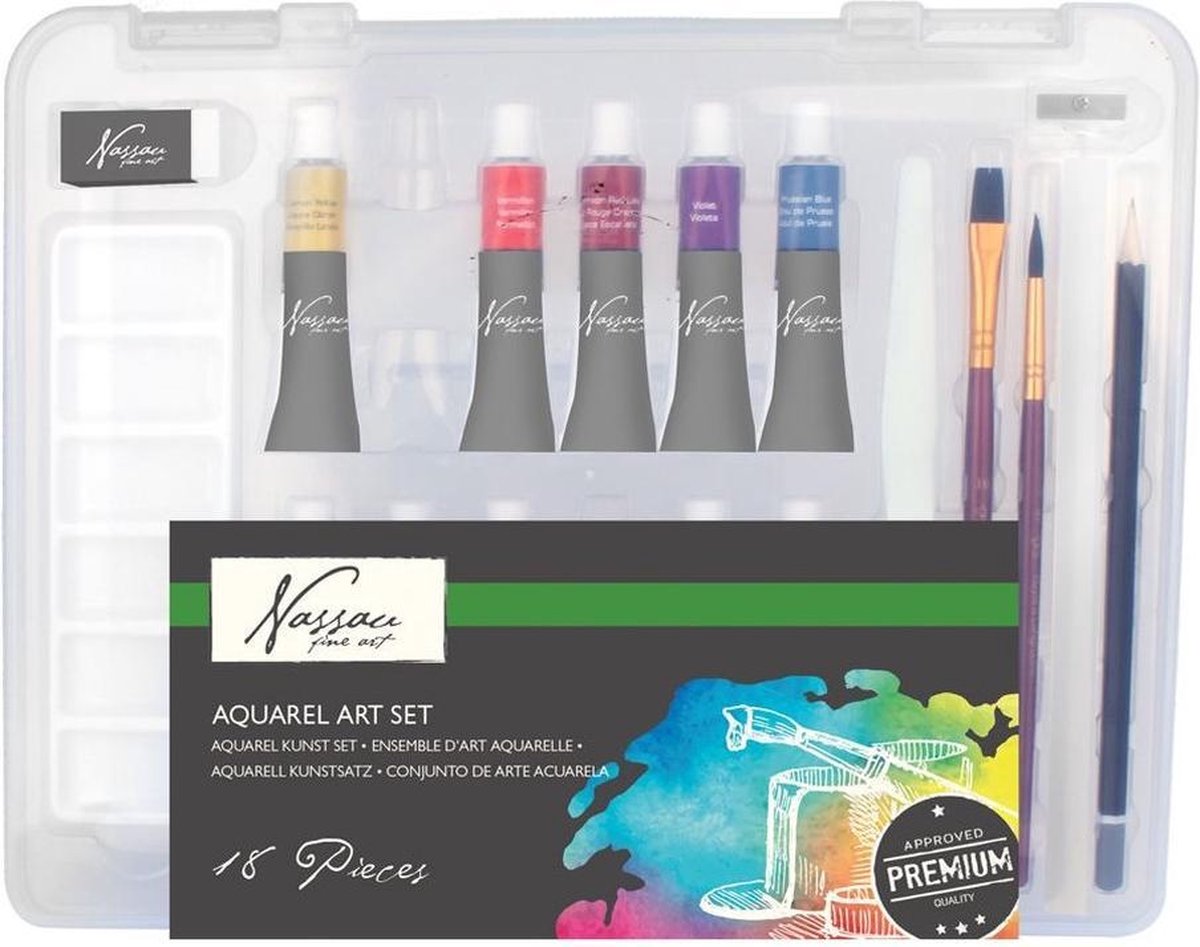 Aquarel verf starterset 18-delig. Schilderen waterverf/aquarelverf starter set. Deze starterset bestaat uit 10 tubes aquarel verf, een palet, 2 penselen, een paletmes/spatel, een potlood, een gum, een puntenslijper en een opbergdoos. U kunt de verf verdunnen met water om zo prachtige creaties te verven/schilderen! Inhoud per tube: 12 ml. Afmetingen doos: ca. 25,5 x 23,4 x 2 cm. Merk: Nassau. Hobbymateriaal/knutselmateriaal aquarel verf op waterbasis. Schilder benodigdheden. Verf voor jongens/meisjes/kinderen/volwassenen om mee te knutselen/aquarellen. Creatief speelgoed voor kleine kunstenaars.
