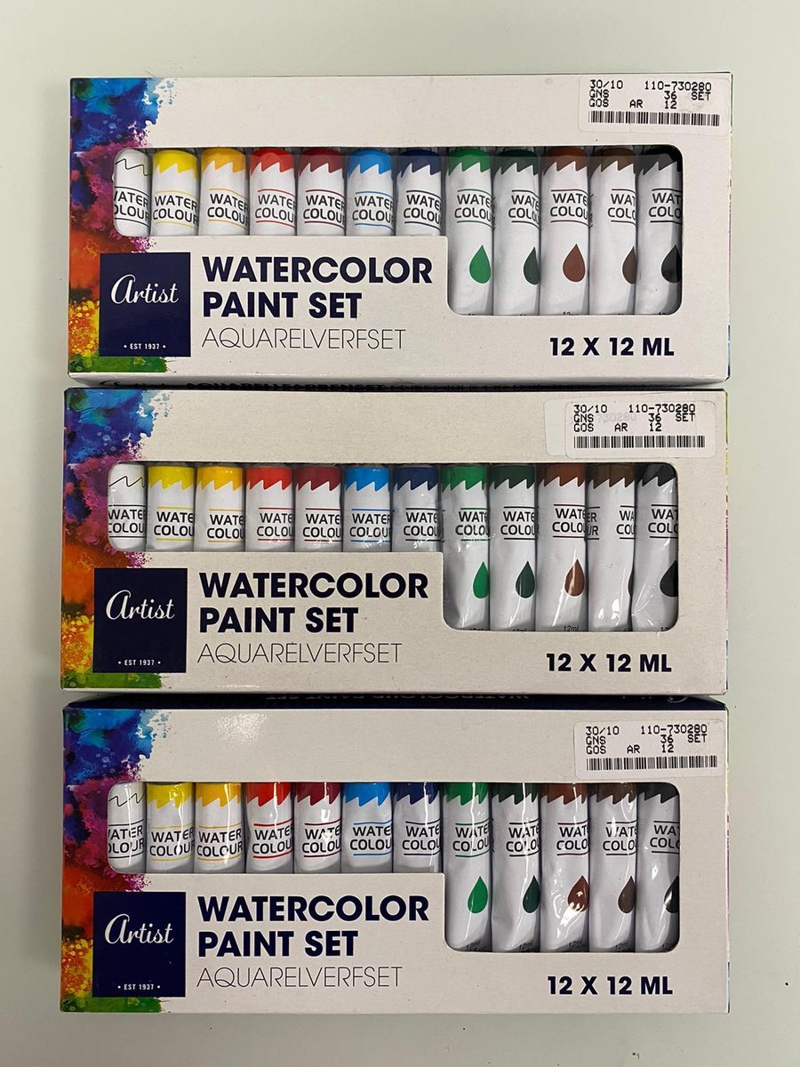Aquarel verfset: watercolor paint set (diverse kleuren) - 3 keer 12 tubes (12 ml), van zeer goede kwaliteit en ideaal om te gebruiken als u creatief wilt zijn en iets moois willt schilderen! Geschikt voor op diverse materialen zoals canvas en hout.