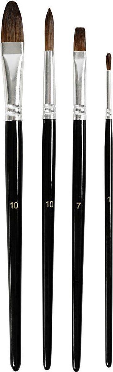 Inhoud: 2 rond (maat 1 + 10), 1 plat (maat 7) en 1 tongvormig (maat 10) Speciale penselen van ponyhaar die door hun hoge absorptievermogen bijzonder geschikt zijn voor aquarel / waterverven. Set van drie verschillende soorten (rond, plat en zwaar/filbert)