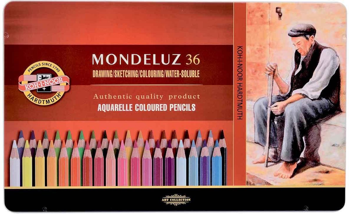 36 Aquarelpotloden in een metalen opbergblik incl. een Cool Rabbit aquarelpenseel om direct aan de slag te gaan. Potloden van kunstenaarskwaliteit van de firma Koh-I-Noor. De zachte stift maakt het mogelijk de kleuren gelijkmatig dekkend op te brengen. De kleuren zijn schitterend, intens en lichtecht. Bij droge verwerking bereikt u hetzelfde resultaat als met gewone kleurpotloden. Zodra water wordt aangebracht met een penseel of spons ontstaan vloeiende aquareltinten.