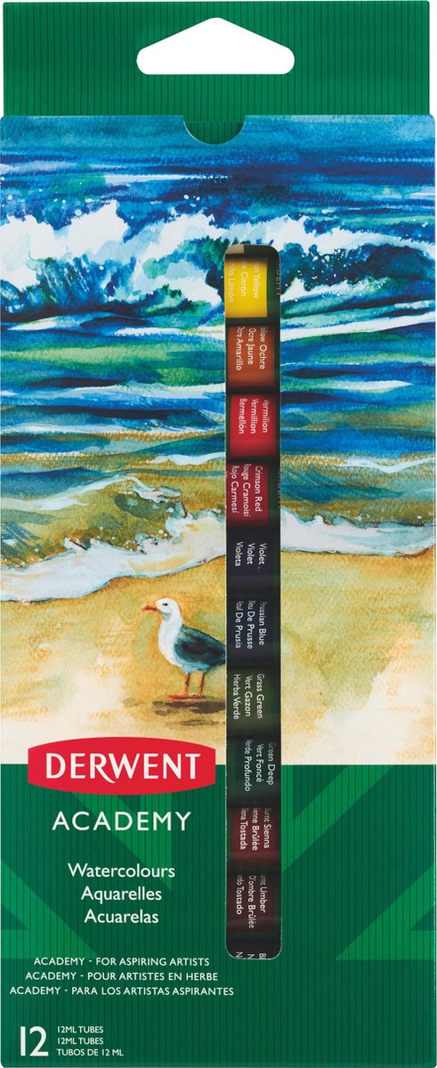 Derwent Academy Aquarelkleuren zijn gemaakt van rijke pigmenten en een eenvoudig te gebruiken formulering die levendige, transparante waterverfkleuren creeërt. Direct vanuit de tube te gebruiken of verdun met water om diverse aquareleffecten te bereiken. Plaats aquarelverf op een palet of gebruik direct op het oppervlak. Alle materialen moeten worden schoongemaakt voordat de verf is opgedroogd. Draai altijd de dop op de tube wanneer je deze niet gebruikt. Kleuren: wit, limoen geel, oker geel, vermiljoen, karmozijn rood, violet, pruisisch blauw, gras groen, diep groen, gebrande sienna, gebrande omber en zwart 1 blister à 12 tubes à 12ml