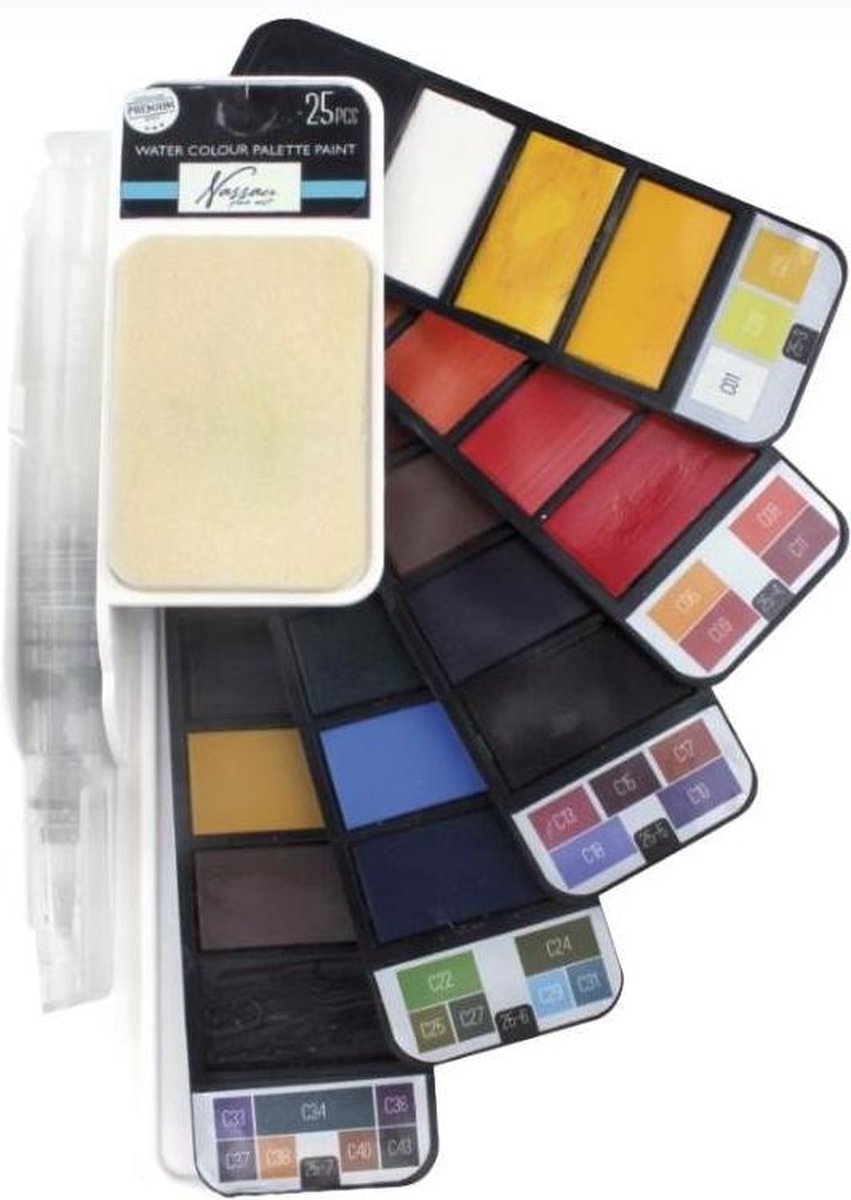 Fijne aquarelverf waaier met hoogwaardige pigmenten en zeer lichtbestendig. Tot 25 mooie kleuren, gemakkelijk onderling mengbaar. Het is ideaal om mee op reis te nemen: een penseel met reservoir (water brush), een spons en een pallet. Zeer compact, om overal mee te nemen. Inhoud: - 25 napjes met verschillende kleuren - 1 penseel met reservoir - 1 spons - 1 mengpallet