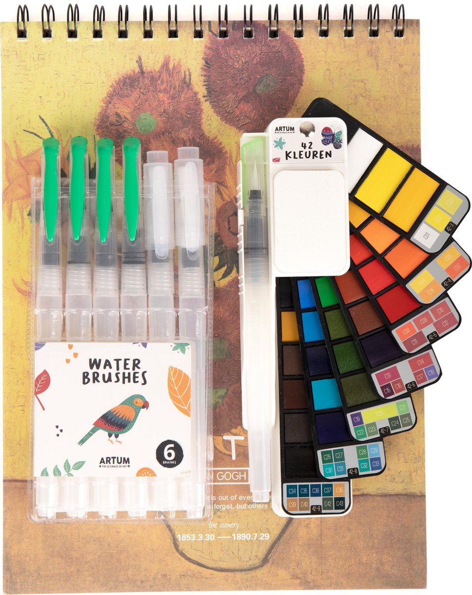 Ben jij op zoek naar een compleet aquarelverf set ? In één keer alles hebben wat je nodig hebt? Wil jij jouw creatieve kant naar voren brengen en de mooiste creaties gemakkelijk laten zien? Of ben je op zoek naar een geweldig cadeau? Deze volledige aquarelverf set van Artum bevat alles wat jij nodig hebt! Aquarelverf Voor het tekenen met water, heb je goede verf nodig. Bij deze complete set zijn 42 kleuren inbegrepen. Zo heb jij alle kleuren die je nodig hebt. De kleuren zijn diep gepigmenteerd en van goede kwaliteit kleurstoffen en Arabische gom. Aquarelverf, check! Aquarelpapier Verven, tekenen of schrijven met aquarel is niet gemakkelijk, zeker niet wanneer je niet het juiste papier hebt. Het A4 schetsblok in dit pakket bestaat uit houtvrij papier met een gewicht van 120 gram. Het papier heeft een correcte verlijming van vezels, waardoor de verf niet uitloopt. Goed papier, check! Brush Pennen Goed tekengerei resulteert in goede resultaten. Deze aquarel set bevat daarom ook 6
