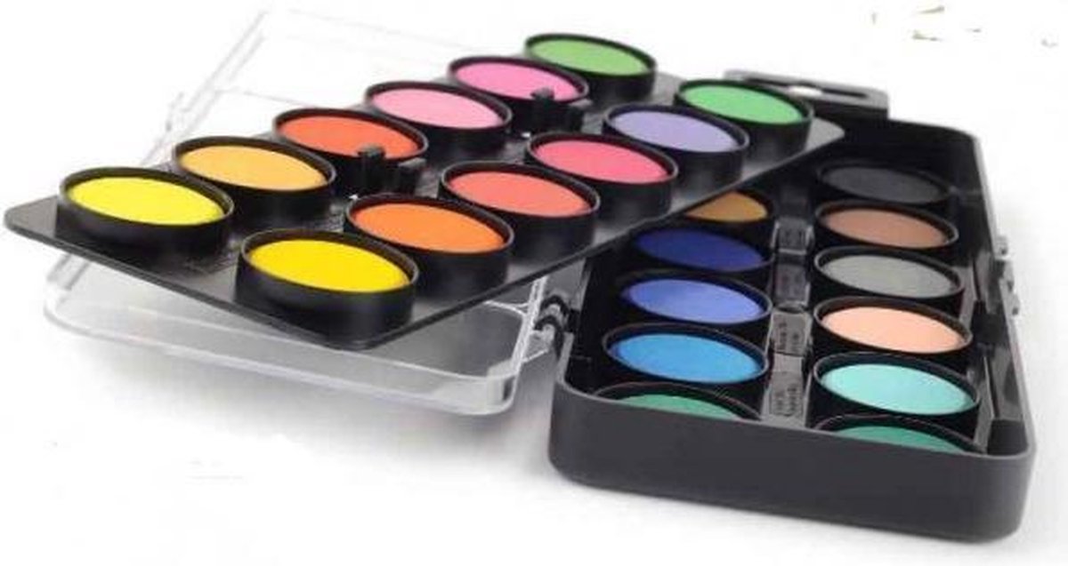 Waterverf van een prima kwaliteit met een hoge pigmentering en daardoor heldere kleuren. De napjes zijn praktisch verdeeld op een zwartkleurig palet met 2 lagen formaat 243 x 94 mm.