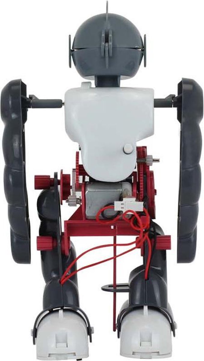 Dit bouwpakket heeft een hoge educatieve waarde en is zowel geschikt voor het onderwijs als voor de hobbyisten onder ons. Kinderen maken spelenderwijs kennis met de spannende wereld van de techniek. Ze leren o.a. om een bouwtekening te lezen, hoe je een schroevendraaier gebruikt en hoe je kabels aansluit Deze robot is 190 mm hoog en draagt de batterijen in de voet. Het bouwpakket werkt op twee AA batterijen. Het is een mechanisch hoogstandje, want als de robot valt staat hij uit zichzelf en op een erg grappige manier weer op. In de uitvoerige handleiding wordt stap voor stap de bouw beschreven en hoe alle tandwielen werken. 13 onderdelen Bouwtijd 30 tot 45 minuten