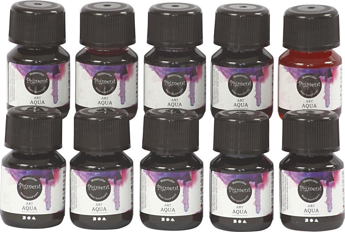 Vloeibare, transparante waterverf van goede kwaliteit - de kleuren zijn onderling te mengen en kunnen verdund worden met water Inhoud: 10 kleuren van elk 250 ml