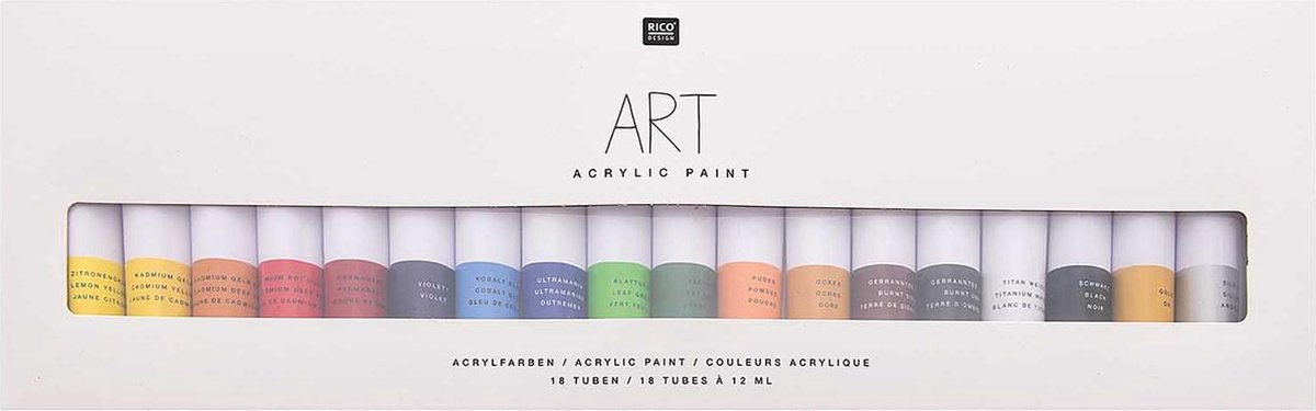 Ervaar de hoogwaardige kwaliteit van Rico Design's acrylverf en haal het maximale uit je kunstwerk. Je kunt de kleuren puur gebruiken, maar je kunt ze ook onderling mengen. Te gebruiken voor : Acrylverf is geschikt voor verschillende ondergronden. Over het algemeen wordt acrylverf gebruikt voor schildersdoeken, maar je kan het bijvoorbeeld ook gebruiken voor het decoreren van wanden, gebruiksvoorwerpen en andere 3D objecten. Laat je creativiteit de vrije loop! DETAILS: Kleur : Multi Color Aantal Tubes : 18 Hoeveelheid : 12 ML / Tube