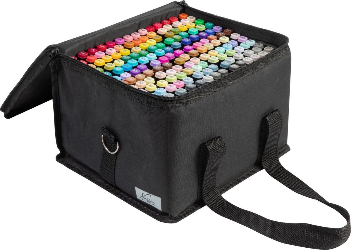 Deze Opbergtas met 168 kleurrijke dual-tip markers van Nassau Fine Art zijn een must have voor elke creatieveling. Met dit uitgebreide kleurenpallet maak je de mooiste kaarten, illustraties en handlettering. De stiften zijn gemaakt op basis van alcohol wat als voordeel heeft dat je mooie kleurovergangen, licht en schaduw effecten kunt maken. Ook kun je meerdere keren over eenzelfde stukje heen kleuren zonder dat papier gaat rullen. Je kunt de stiften aan beide kanten gebruiken waarbij een zijde een ronde en smalle tip heeft en de andere zijde een brede en platte tip. De markers worden geleverd in een stevig etui waarin je ze makkelijk kunt opbergen en meenemen. ?? Voor een extra mooi effect gebruik je speciaal markerpapier om doordrukken van kleuren te voorkomen. Voordelen dual-tip markers ? Perfect om egale vlakken te creëren ? Ideaal om licht en schaduw effecten aan je creatie toe te voegen ? Moeiteloos kleuren in elkaar over laten lopen ? Vlakken kleuren zonder stiftstrepen ?