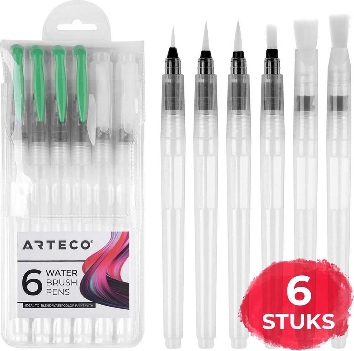 Doe jij niets liever dan creatief bezig zijn? Met de ARTECO® waterbrush pennen set creëer jij de mooiste schilderijen, intrinsieke details en vloeiende lijnen! Met 6 verschillende waterbrushpennen voorzien van ieder een eigen precisie tip geniet jij van eindeloos veel mogelijkheden en tekenplezier. Breng de kunstenaar in jezelf naar boven en creëer de tekeningen of kunstwerken waar je altijd al van droomde. Multifunctioneel Jouw nieuwe waterbrush pennen hebben elk een eigen brush tip waarmee je gemakkelijk tussen tekenstijlen kunt switchen. Zo zijn de brush pennen onder andere geschikt voor kalligrafie, brushlettering én aquarelverf en vind jij alles wat je nodig hebt in één set. Creatieve vrijheid Met 6 unieke waterbrush pennen laat jij jouw creativiteit de vrije loop en zijn de mogelijkheden eindeloos. Deze handige accessoires creëren prachtige gradiënten en zijn perfect geschikt om lijnen uit te blenden. Leng het pigment van penseelstiften, aquarelverf met water aan en