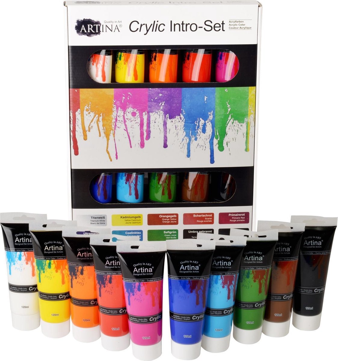 Deze kwalitatieve acrylverf van Artina heeft uitstekende eigenschappen. De hoge opaciteit van de kleuren, de goede lichtechtheid en snel droogproces, evenals een optimale kleurkracht maken ze een populaire keuze bij beginners en hobbyisten. De kleuren zijn gemaakt uit hoogwaardige pigmenten en garanderen u een goed product tegen een redelijke prijs. Uiteraard zijn de Artina acrylverven verdunbaar met water en daardoor zeer variabel. De kleuren zijn na droging permanent waterdicht. De set bevat de volgende kleuren: Titanium Wit 120ml Zwart 120ml Cadmium Geel 120ml Sap Groen 120ml Ultramarijn Blauw 120ml Scharlaken 120ml Umbra verbrand 120ml Oranje Geel 120 ml Primaire rood 120 ml Coelin Blauw 120 ml - De Crylic acrylverf set van het populaire merk Artina bestaat uit 10 tubes van 120 ml en is geschikt voor kunstenaars, hobbykunstenaars en veelgebruikers. - De Artina Crylic Acryl Colours worden gekenmerkt door een hoge opaciteit, goede lichtechtheid en een optimale kleurintensiteit en
