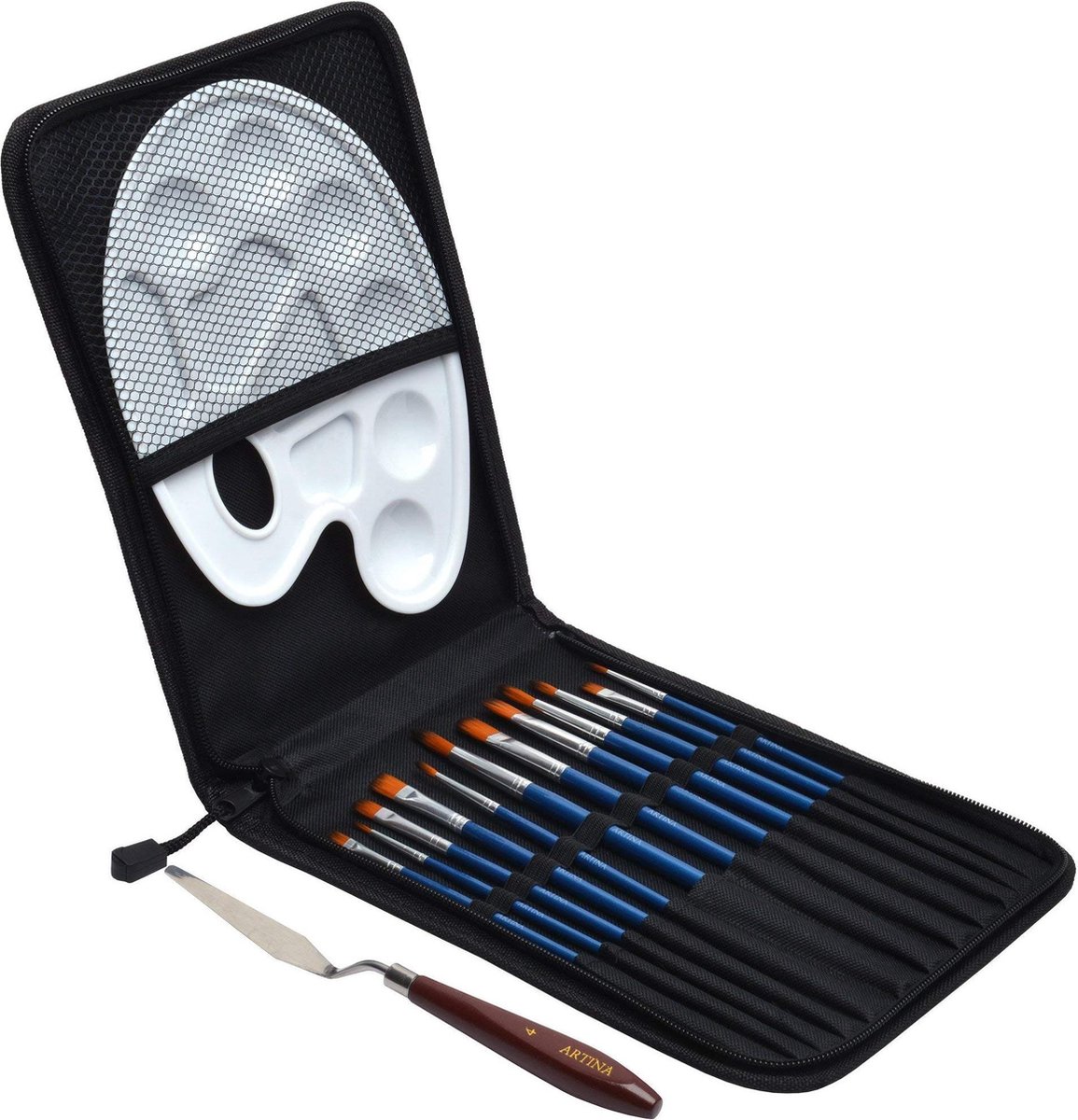 Als u een praktische set in een mooi etui nodig heeft, kunt u stoppen met zoeken! Deze set van bevat alle tools die je als kunstenaar nodig hebt. Of het nu gaat om acryl schilderen, aquarelleren, schilderen met olieverf, voor spateltechniek, voor kunstlessen en nog veel meer, de nylon borstelharen beheersen elke schildertechniek. De set bevat: 6x Punt penselen (Maten #1, #3, #5, #7, #7, #8, #10, #1, #3, #5, #7, #8, #10) 6x Platte penselen (Maten #2, #4, #6, #7, #7, #8 en #10) Kunststof mengpallet 22x16,5 cm met 10 mengvelden 1x Paletmes (Maat #4, houten handvat, 21 cm) Etui, zwart 26 x 20 x 2,5cm