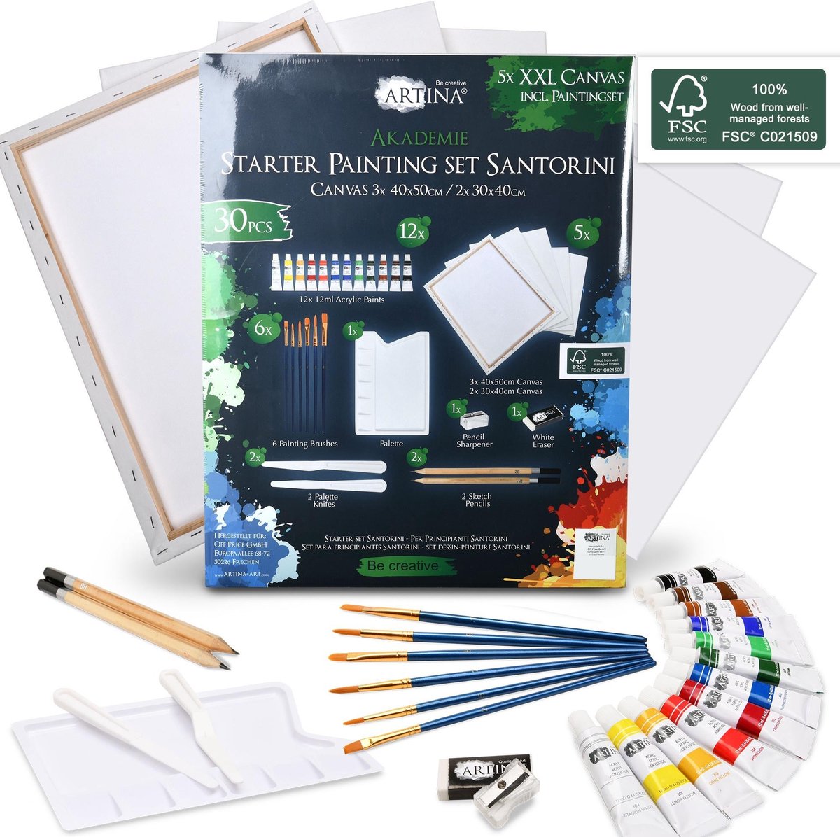Wij bieden u met deze set de optimale combinatie om uw schilderervaring volledig te kunnen beginnen. Inbegrepen zijn 5 canvassen in 2 maten, bestaande uit 100% katoen dubbel wit geprimed. Het omvangrijke set omvat 2 potloden, geschikt voor het maken van schetsen. Verder biedt het Acryl set 12 verschillende acrylkleuren in 12ml tubes, een mengpalet, paletmessen en 6x penselen voor het schilderen. Inhoud 5x Canvassen - 3x 40 x 50 cm - 2x 30 x 40 cm 12x 12 ml acrylverf in tubes 6x Penselen 2x Paletmessen 1x Mengpallet 2x Tekenpennen 1x Wit gummetje 1x Puntenslijper