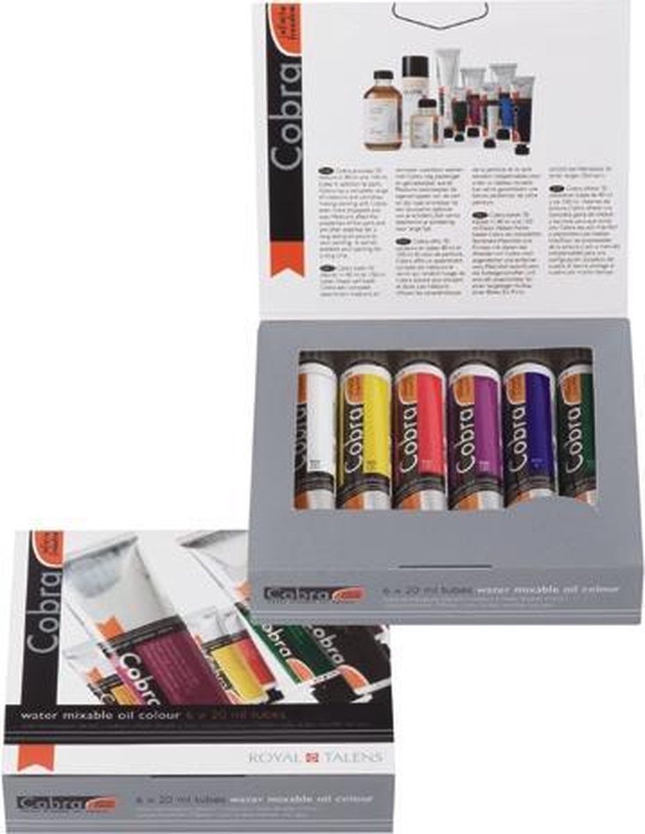 Introset Cobra Artist watervermengbare olieverf met zes 20 ml tubes in prachtige kleuren, om te mengen of puur te gebruiken. Cobra is de nieuwe generatie olieverf van Royal Talens. Een fantastische lijn watervermengbare olieverf waarbij je geen oplosmiddelen meer nodig hebt. Dat is beter voor je gezondheid en het geeft je de vrijheid om te schilderen waar je maar wilt. Met Cobra kun je in alle gangbare olieverftechnieken werken, het resultaat is schitterend en intens. Cobra Artist is een professionele kwaliteit olieverf met de allerhoogste graad van lichtechtheid. Dat wil zeggen dat de kleuren, onder museumomstandigheden, minimaal 100 jaar lichtecht blijven. Dankzij de zeer hoge pigmentconcentratie zijn de kleuren ook nog eens bijzonder kleurkrachtig. Cobra Artist watervermengbare olieverf laat zich prettig verwerken en dankzij de unieke samenstelling heb je alleen maar water nodig om aan de slag te kunnen. Je penselen en ander gereedschap kun je gewoon met wat water en zeep reinigen.