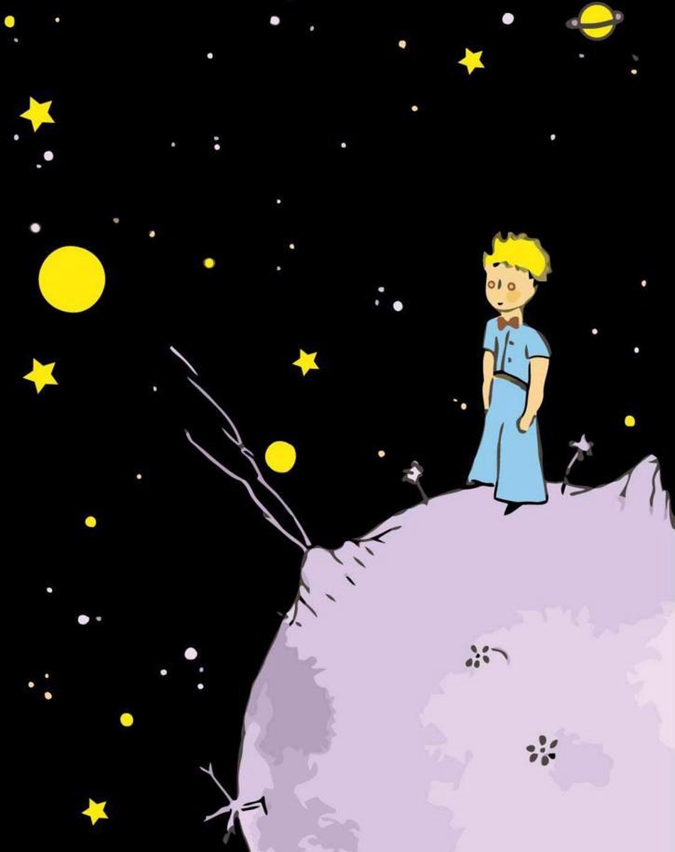 Deze afbeelding is geïnspireerd op het verhaal van de Kleine Prins. Canvas, acrylverf, penselen alles inbegrepen met getallen op elk segment van het canvas dat overeenkomt met de juiste verf. -Canvas-afmeting is 40x50cm. -Frame is niet inbegrepen