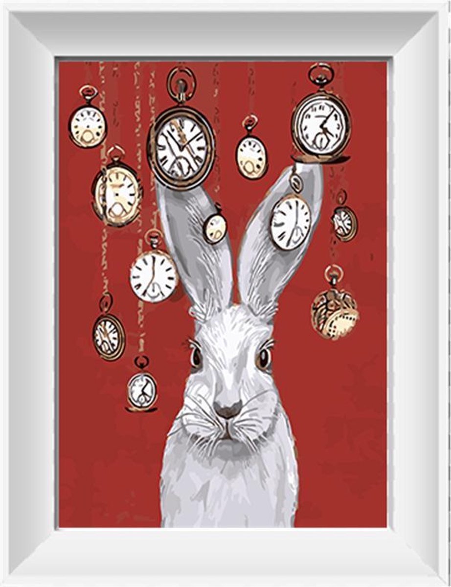 Artstudioclub® Schilderen op nummer volwassenen konijn en horloges op rode achtergrond Zonder lijst