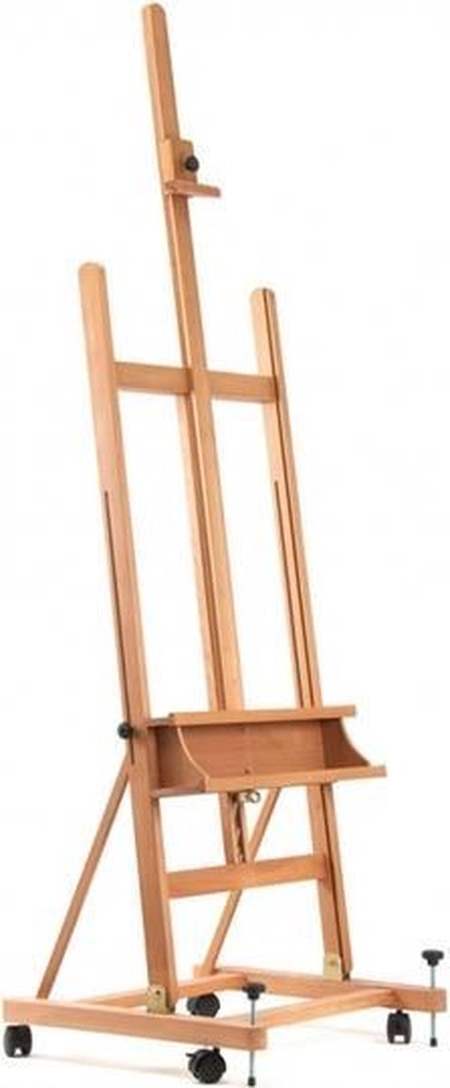 Atelierezel / Schildersezel Paris van Paintersworld , Schildersezel van gestoomd en geolied beukenhout, Stevige H-vormige constructie op wieltjes, Kan dus makkelijk verplaatst worden, Grote penseelbak, Verstelbare hoogte en kantelhoek, Wordt gemonteerd geleverd, Grondoppervlak : 64 x 60 cm, Maximale doekhoogte: 140 cm, Gewicht : 13 kg , , Uitpakken & opstellen: De schildersezel zit al volledig gemonteerd in de verpakking enkel door het formaat is 1 onderdeel omgedraaid zodat de schildersezel in de verpakking past. De penselenbak zit aan de verkeerde kant van de schildersezel in de verpakking. Bij het uitpakken haalt u voorzichtig de penselenbak inclusief de houten lat van de schildersezel. Vervolgens legt u de schildersezel plat op de grond. Nu schuift u vanaf de onderkant van de schildersezel eerst de lat door de groef die aan de bovenkant zit. U kunt nu alles voorzichtig doorschuiven totdat de penselenbak ook op zijn plaats zit en in het metalen deel valt waar u de doek hoogte kunt