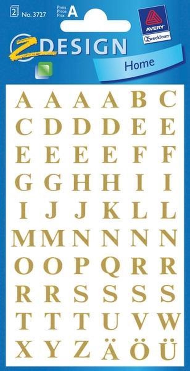 Verschillende letters. Voor het aanbrengen van teksten op kantoor, thuis of op school. Formaat vel 76x12 0mm. Aantal vel 2. Letters 7,5 mm goud.