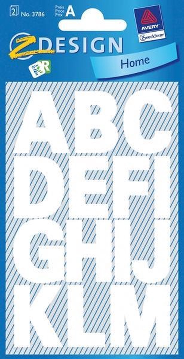 Verschillende letters. Voor het aanbrengen van teksten op kantoor, thuis of op school. Weerbestendig. Formaat vel 76x120 mm. Aantal vel 2. Letters 25 mm wit.