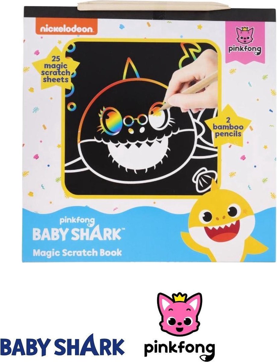 Ga lekker krassen in dit magische kleurboek en ontdek welke mooie tekeningen er tevoorschijn komen. Baby Shark Magic Scratch Book. Bevat 25 pagina's aan kleurplaten Inclusief 2 bamboe kraspennen 21 x 21 Centimeter