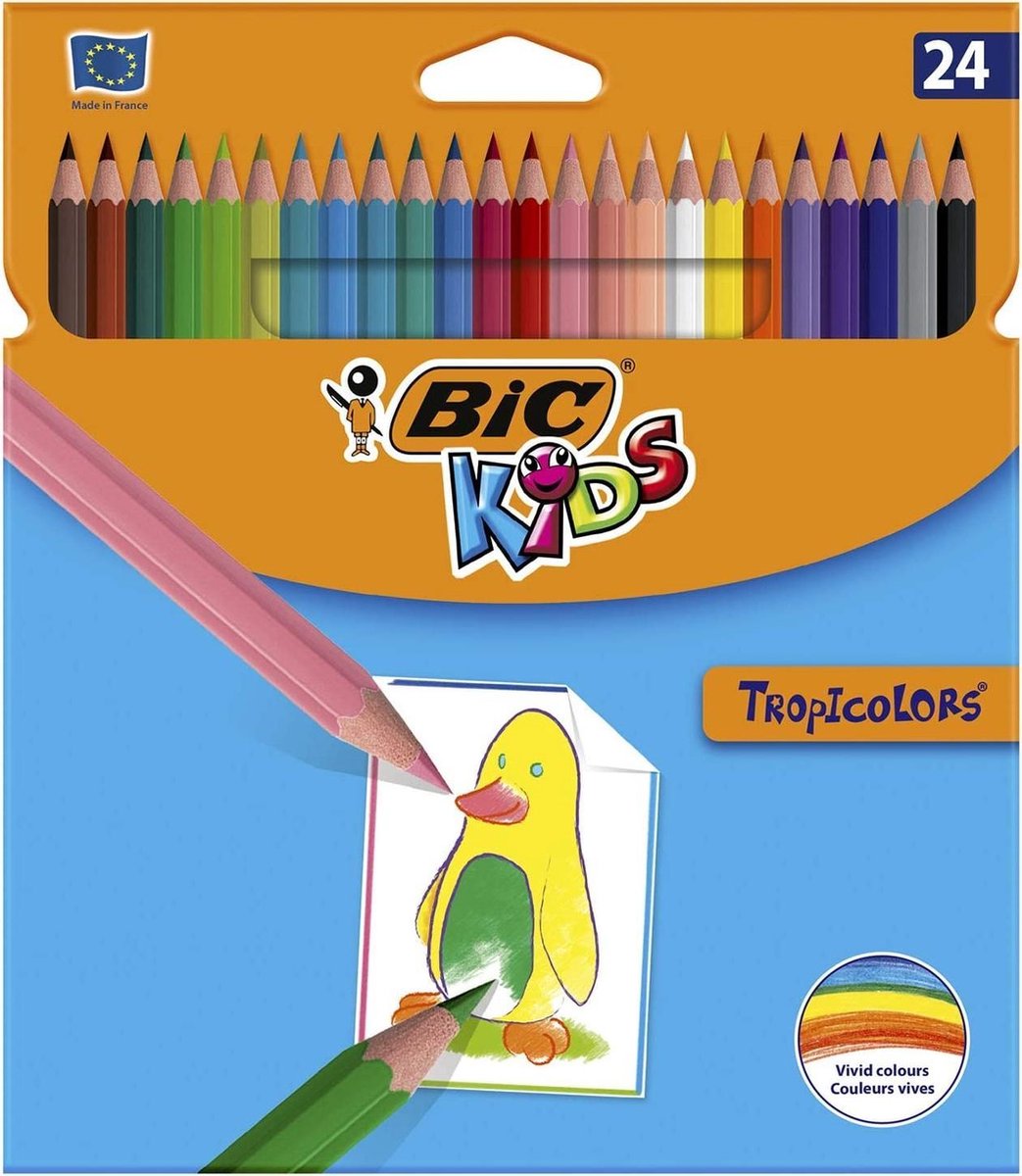 BIC kleurpotloden ~Bic Kids Tropicolors Kinderstiften Ontdek de verborgen) Picasso in jouw kleine met deze BIC Kids kleurpotloden. De potloden zijn speciaal ontwikkeld voor kinderen en (leren) tekenen wordt zo nog leuker! De karaktereigenschappen van de BIC Kids Tropicolors op een rij: Blister met 24 potloden in verschillende kleuren De potloden zijn zeshoekig qua vorm en het lichaam heeft dezelfde kleur als de stift: zo zijn de verschillende kleuren snel te herkennen Met een potloodpunt van 2.9 mm kan vrijwel ieder kind goede lijnen tekenen De potloden worden zonder hout gemaakt: dus geen zorgen over splinters! BIC Kids ~ BIC maakt al meer dan 65 jaar hoogwaardige schrijfproducten. BIC Kids is een assortiment aan kleurinstrumenten dat BIC speciaal ontwikkelde om de creativiteit van jonge kinderen te stimuleren wanneer zij Trefwoorden Ideaal voor dagelijks tekenen en schilderen op de kleuterschool, op school of onderweg. De kleurpotloden zijn zonder hout gemaakt en splinteren zelfs
