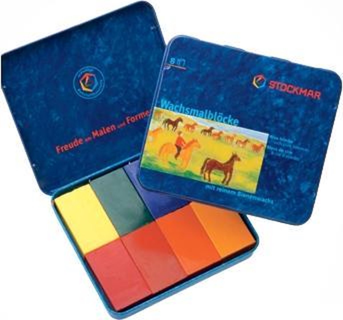 8 Blokkrijtjes met kleuterkleuren in een mooi blikken doosje. Iedereen kent de Stockmar waskrijtjes. Ze voldoen aan de hoogste pedagogische, esthetische en kunstzinnige eisen. Door hun grootte en platte vorm liggen de blokjes stevig en vast in de hand en zijn daardoor uitermate geschikt voor het kleine kind. Ook geven deze krijtjes een direct en konstant resultaat. Het kind kan met het onbreekbare en veilige blokkrijtje lijnen trekken maar ook grote vlakken in kleuren. Tags: knutselen, Stockmar.