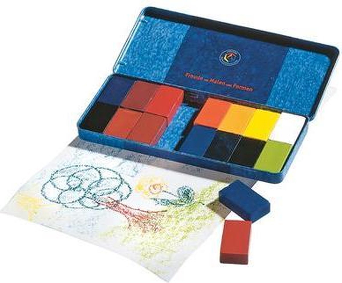 De wasblokjes, uit hetzelfde materiaal gemaakt en in dezelfde kleuren verkrijgbaar als de stiften, hebben uitstekende tekeneigenschappen en spreken de zintuigen aan. Door hun grootte en hun platte vorm zijn ze bijzonder geschikt voor kleinere kinderen, aangezien ze vast in de hand liggen. Bovendien kunnen kinderen met de blokjes goed vlakken kleuren, dikke lagen aanbrengen en interessante effecten bewerkstelligen, waarbij ze bijv. met de lange kant golven over het papier trekken. Vanaf de allereerste 'stift', het onbreekbare wasblokje, is het Stockmar assortiment gegroeid. Zo ook de artistieke toepassingen. Blikken etui, 16 blokken á 41x23x12 mm, met schraper, 16 kleuren gesorteerd Kleur: 01 karmijnrood | 02 vermiljoen | 03 oranje | 04 goudgeel | 05 citroengeel | 06 geelgroen | 07 groen | 08 blauwgroen | 09 blauw | 10 ultramarijnblauw | 11 blauwviolet | 12 roodviolet | 13 roodbruin | 14 geelbruin | 15 zwart | 16 wit --- De krijtblokjes zitten in een blikken etui. Het zijn 16 stuks.