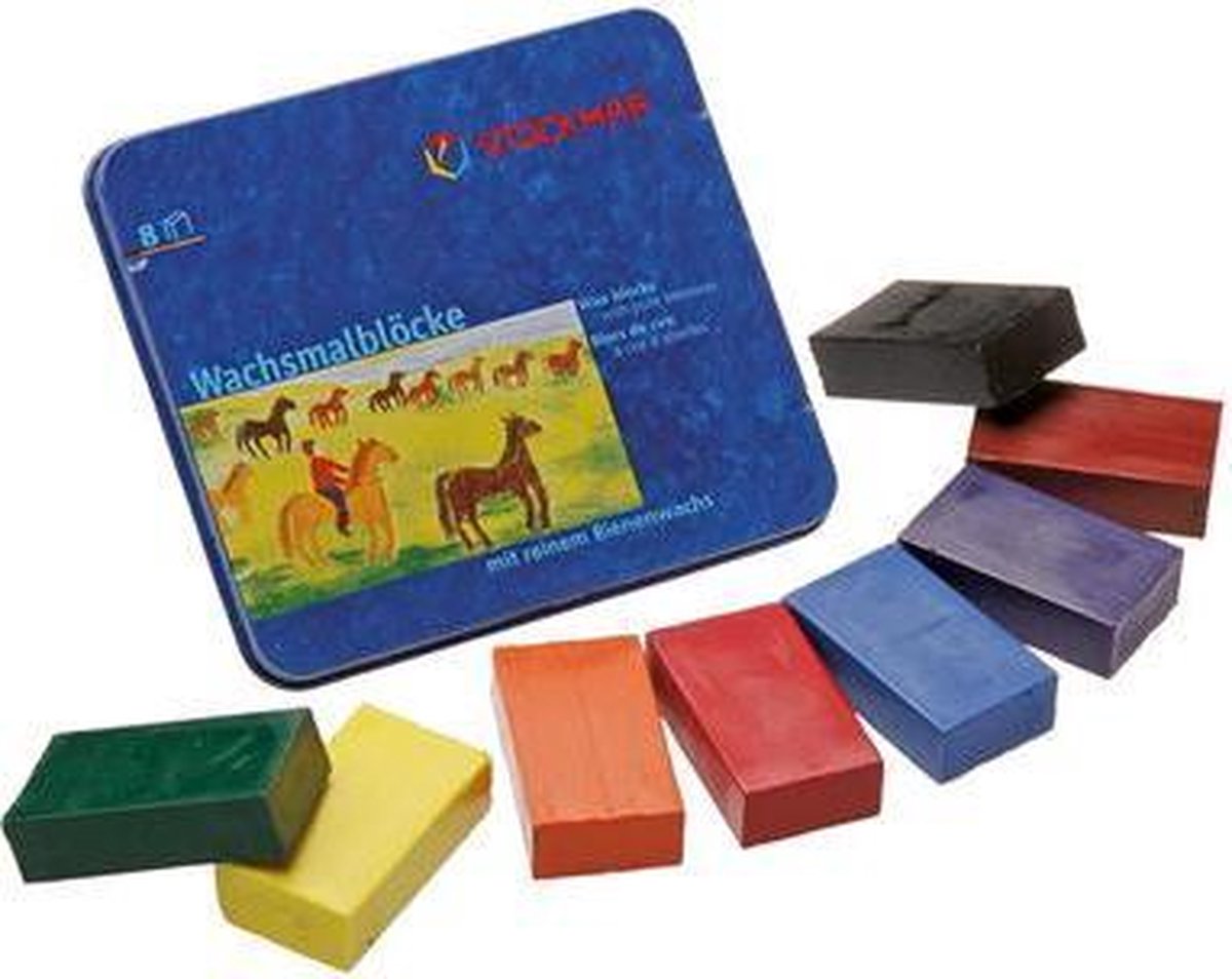 Stockmar bijenwasblokjes - 8 waldorfkleuren assortiment - geproduceerd in Duitsland - spiel gut gecertificeerd. De wasblokjes worden geleverd in een blikken etui. Stockmar waskrijtjes voldoen aan de hoogste pedagogische, esthetische en kunstzinnige eisen. Door een elegant design, een attractieve verpakking en een plezierige bijenwasgeur, appelleren Stockmar krijtjes aan de zintuigen van het kind. Wat een veelvoud en helderheid aan kleuren en wat een verscheidenheid in het gebruik! Of ze er nu vet of licht mee kleuren, tekenen, schilderen, krassen of kleuren laten "versmelten", deze krijtjes geven jarenlang teken- en kleurplezier Verder worden, door de bijenwas en de daardoor verkregen transparantheid, de kleuren niet vies en grauw, kruimelt het krijt niet, zijn ze niet giftig en voldoen aan de hoogste eisen qua milieu en gezondheid. Dit alles maakt deze krijtjes de beste in hun soort. De wasblokjes, worden van hetzelfde materiaal vervaardigd en zijn verkrijgbaar in dezelfde kleuren