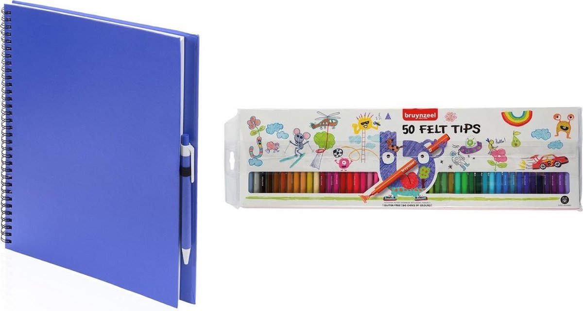 Schetsboek/Tekeningen maken luxe blok met 80x vellen wit papier met harde blauwe kaft en spiraal binding en een etui met 50 viltstiften. De afmetingen van het boekje zijn ongeveer 21 x 29 x 2 centimeter. Formaat: A4 papier. Super de luxe schetsboek/opschrijfblok/notitieblok voor kinderen en volwassenen.