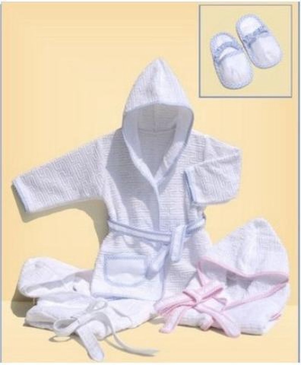Witte badstof met bijpassende slofjes maat 86, in wit met roze, blauwe of witte rand, voorzien van aidaband.