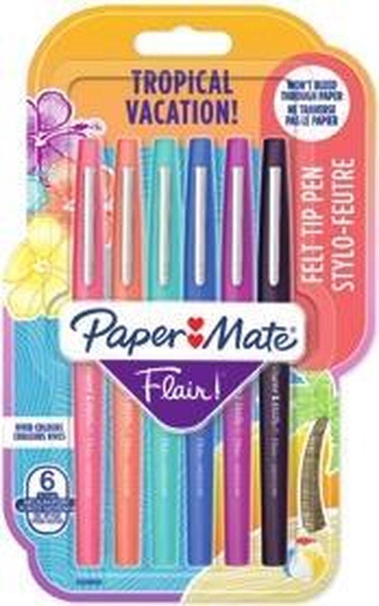 Papermate Flair Tropical. Soort: Afgetopte gelpen, Schrijfkleuren: Zwart, Blauw, Oranje, Roze, Paars, Kleur van het product: Zwart, Blauw, Oranje, Roze, Paars. Type verpakking: Blister. Aantal per verpakking: 6 stuk(s)
