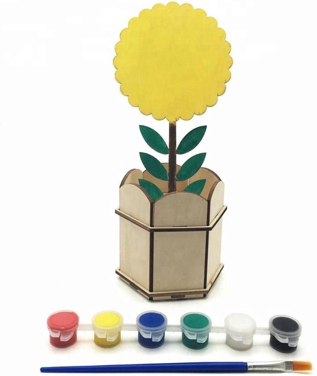Leuk pakketje met houten bloemen die je in mooie decoratieve kleuren zelf kunt schilderen. Inclusief DIY bloempotje, 6 kleuren verf en penseeltje Diameter bloempot (in cm.): 10 Moeilijkheidsgraad: Zeer eenvoudig