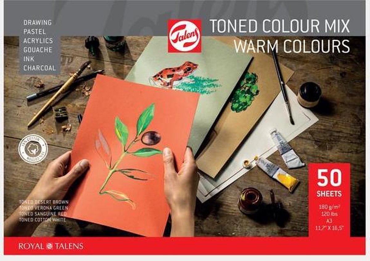 Toned Colour Mix Warm Toned Paper mix warm A3, 180g, 50 Vellen, FSC-MIX De Tales toned cololur mix in warme kleuren biedt verschillende mogelijkheden en is de perfecte basis voor jouw kunstwerk. Het blok bevat papier in de volgende kleuren: Toned desert Brown Toned Verona Green Toned Sanquine Red Toned Cotton White Het getinte papier is gemaakt van 15% katoen en 20 % gerecycled papier en is ideaal voor het gebruik van technieken als pastel, acrylverf, gouache, inkt, houtskool en potlood.