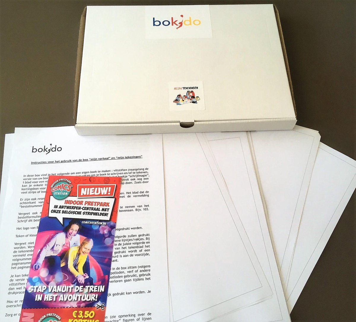 Box met sjablonen om tekeningen te maken, incl. voorkaft en achterkaft : 12 pagina's (incl. kaft). Het boekje wordt echt gedrukt. Met een bestelformulier voor je eigen gedrukt boek met tekeningen. Stuur de tekeningen op en je krijgt een gedrukt boekje terug. Een eigen gedrukt boekje van 12 pagina's met tekeningen. Leuk als herinnering om te bewaren of om cadeau te geven ! Voor jongere kinderen die nog geen teksten kunnen schrijven of voor kinderen die gewoon graag tekeningen maken. Meer informatie op www.bokido.be Met deze aankoop steunt u ook vzw Bednet en vzw Pelicano Foundation