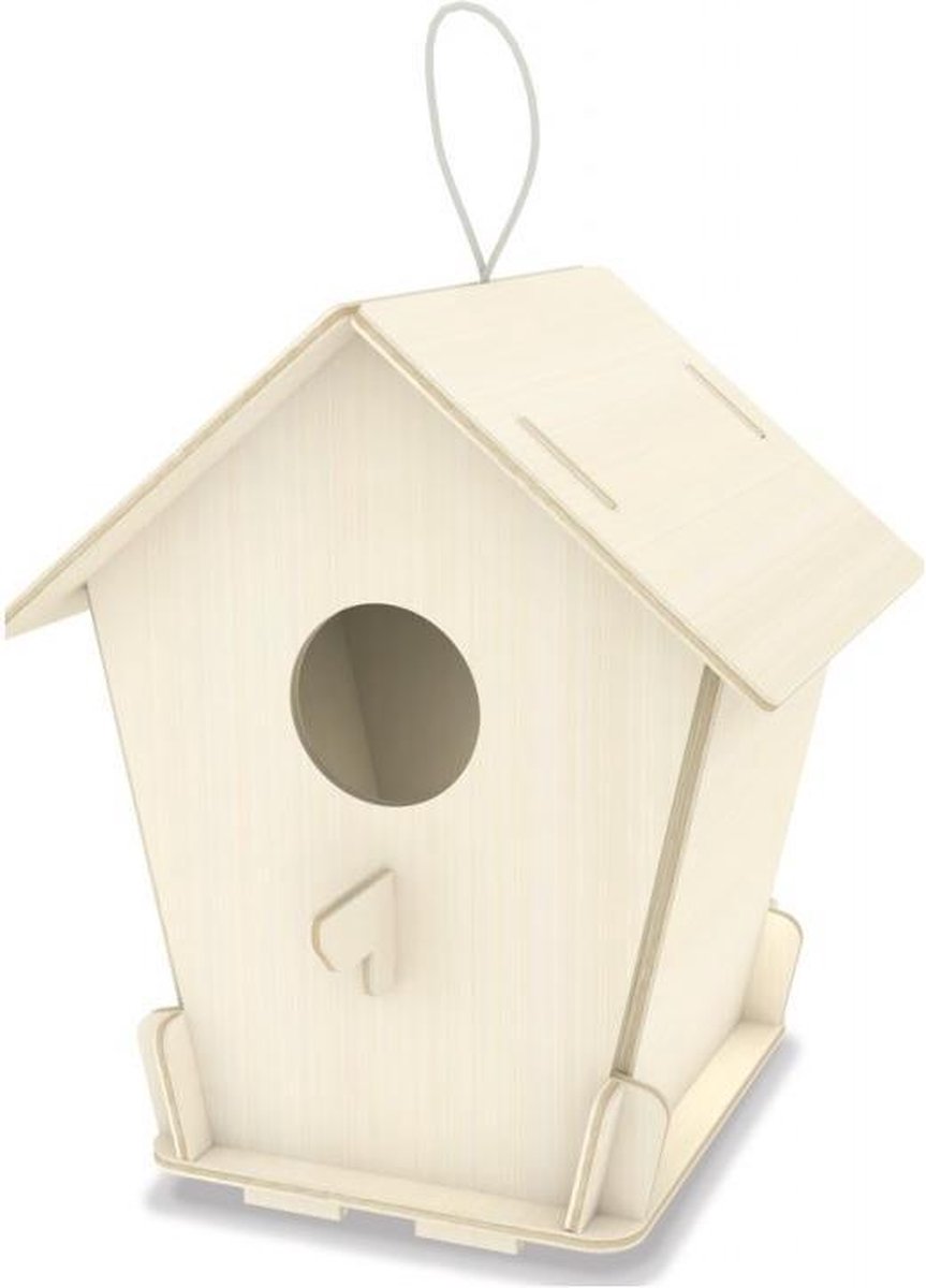 Bouwpakket van een leuk vogelhuisje voor in de tuin. Eenvoudig in elkaar te zetten voor iedereen vanaf 6 jaar. 11 onderdelen. Het hout is goed te schilderen, maar let even op: Op de verpakking staat dat er verf en penseel zijn ingesloten, maar dit is helaas NIET het geval. Geen lijm nodig; de onderdelen klemmen stevig in elkaar