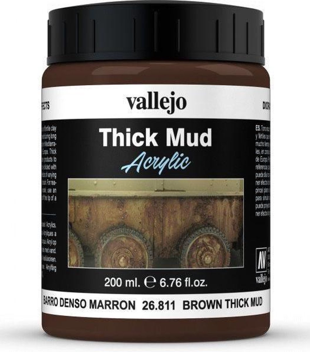 Vallejo Brown Mud Thick Mud Weathering Effects contains 200ml Brown Mud Thick Mud. Dark colored mud, typical of fertile clay lands where humidity is retained during long seasonal periods, found mostly in Mediterranean areas and the west of Europe. The range consists of 6 products with a heavy and thick consistency and a slightly glossy finish, ideal for reproducing terrain on vignettes or dioramas, as well as for texture on wheels and the lower part of vehicles, the chains of armored cars and accumulations of mud on the tracks. The remains of vegetation included in some of the references provide an especially realistic texture to the final aspect of the model.