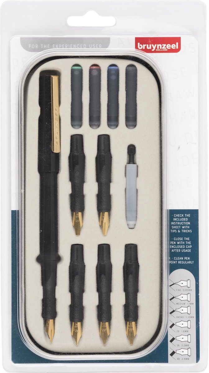Leren kalligraferen doe je met de toegankelijke kalligrafiesets van Bruynzeel! Deze handige bewaarbox bevat 6 verschillende messing penpunten (medium, fijn, breed, 4B, Scroll 4 en Scroll 6), een converter, 4 kleuren inktpatronen en 4 afsluitdopjes. Inclusief een uitgebreide instructieleaflet.