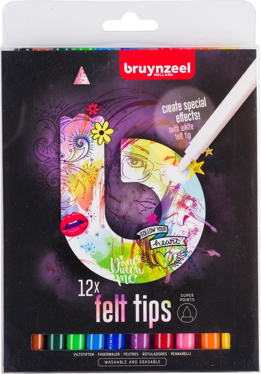 De Super Point viltstiften van Bruynzeel zijn onmisbaar in je schooltas! Met de speciale punt – die je niet kan indrukken – kan je zowel dikke als dunne lijnen kleuren. Grote werkstukken zijn binnen no-time af. Met de witte stift kan je gekleurde vlakken weer wit maken, wat handig is als je buiten de lijntjes hebt gekleurd. De inkt is ook uitwasbaar (na voorbehandeling) met de witte wisstift. De viltstiften zitten in een compact bewaarblik, handig voor in de schooltas. De verpakking bevat 11 kleuren viltstiften en 1 witte wisstift. Glutenvrij. Bruynzeel Teens Speciaal ontwikkelde lijn voor de scholier en de student. Het is een compleet assortiment met alle teken-, kleur- en schrijfproducten die nodig zijn tijdens de les. Van kleurpotlood en passer tot viltstiften en puntenslijpers. Alle Teens producten passen makkelijk in de rugtas.
