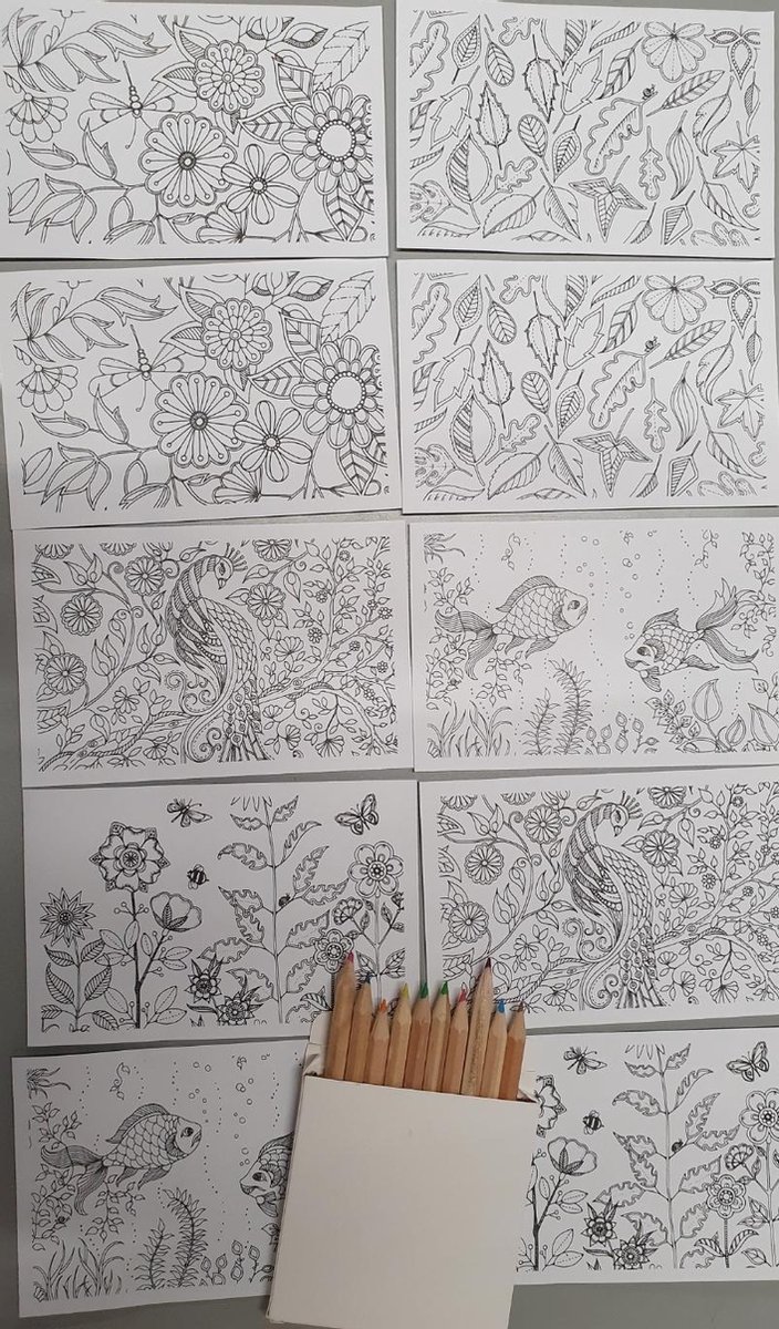 Leuke tekenset met 10 verschillende kleurplaatjes en 10 potloden. Per set geleverd in kale kartonnen doosje.